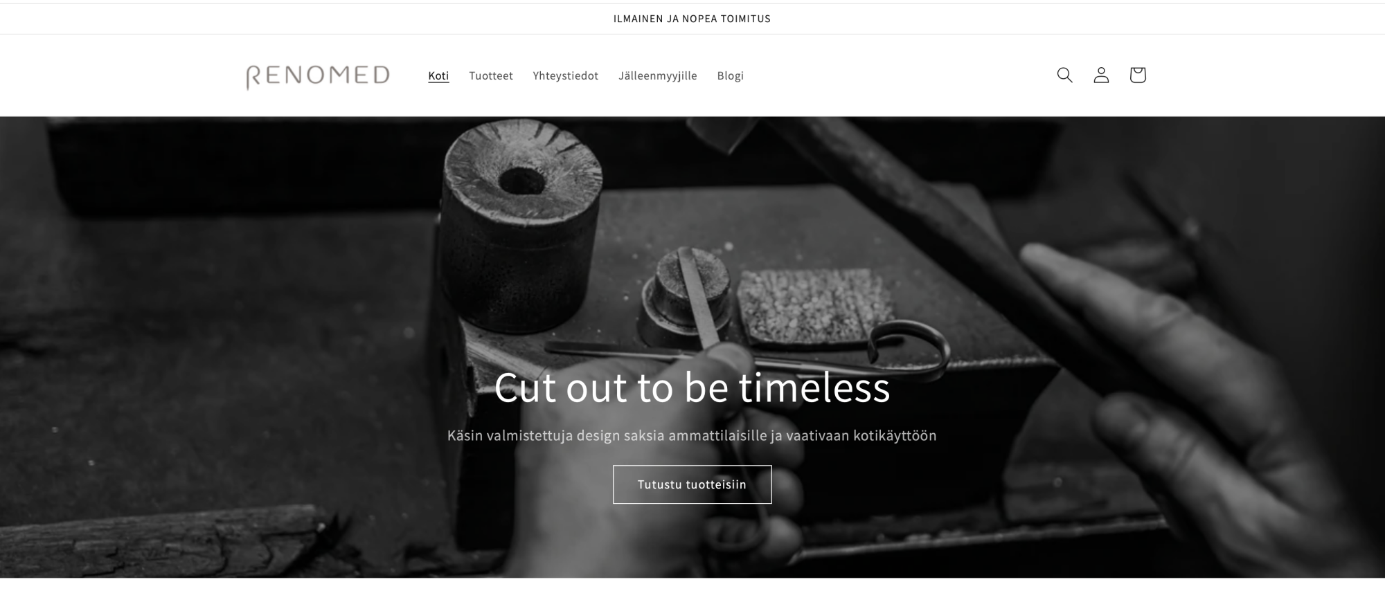 Renomed Finland tarvitsi verkkokaupparatkaisun, jolla uusi liiketoiminta-aue saataisiin koeponnistettua ketterästi ja matalalla riskillä. JMC Nordic toteutti asiakkaalle verkkosivuston Shopify-alustalle, suunnitellen rakenteen ja visuaalisen ilmeen käyttäjäystävälliseksi ja konversioita tukevaksi.